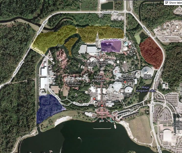 The image below shows a map of MK with the likely area to expand upon colored in. The only thing about the map is that it is likely not going to happen that land is built in the yellow area b/c it is around the area where the fireworks are shot off behind the castle so if anything was built there, it would have to be shut down during the fireworks. So it COULD happen, it is just not as likely.